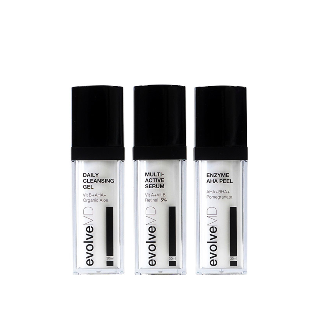 CONTENTS: Daily Cleansing Gel, Multi-Active Serum, Enzyme AHA Peel